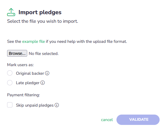 NOTE: As a creator, you should ensure that all imported unpaid pledges were not cancelled by backers themselves, but were incomplete because of other reasons, e.g. failure to collect payment.