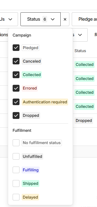 To obtain an export file from an external platform that includes incomplete pledges, you need to select more statuses than are chosen by default.