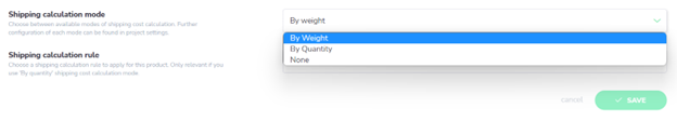When you set up the locations, shipping models, shipping zones/shipping cost rules, you need to ensure that every product has the right shipping calculation selected. Choose a product ( "Products," "Rewards," or "Add-ons" and go to "Reward settings" (or "Product settings" in the case of add-ons) and "Shipping." Then, set the calculation mode to "by weight" or to "by quantity," depending on your needs.