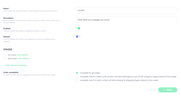 The shipping model defines the shipment options available to vbackers. If you want to give people the option to choose between, for example, the economic and courier shipment, or a single-wave or two-wave shipment, this is the place where you need to set it up. You can also add a description. The description will be displayed as a tooltip next to the shipping model when choosing the shipping method. The shipping model will appear when a backer chooses the shipping method while submitting a pledge. You can also define the shipping stage, zone availability, or change other settings by clicking the description or shipping model name:
