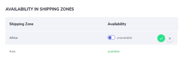 On the left, you'll see a section with "Zone availability." Here, you can add or remove shipping zones for each shipping model. For example, if you can't ship orders using the traditional post to Africa, you have to change the zone settings to "unavailable":