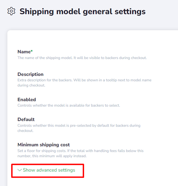 To open advanced settings, go to shipping models, click the model you want to edit and click "Show advanced settings" in general settings: