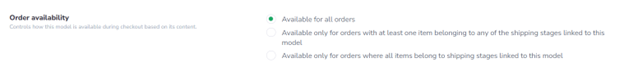 This setting defines how this model is available to backers at checkout based on its content. You can set up availability for all orders, orders with at least one item belonging to any of the shipping stages linked to this model, or orders where all items belong to shipping stages linked to this model.