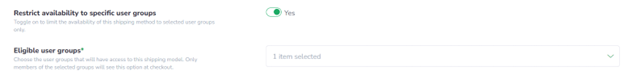 The settings include order availability, restricting availability to specific user groups, applying handling fees, and using volumetric weight.