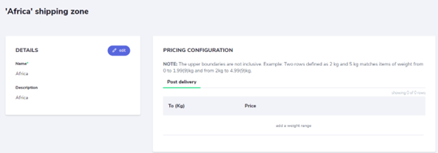 - set up weight and price ranges based on the value of the lowest pledge in "shipping zones" (described above). For example, if a core pledge weighs 2kg and its shipping to Africa costs 30$, you have to set up the price and weight range to be 2kg and 30$: