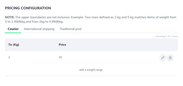 You can add the cost of shipping for different weights of packages by clicking "add a weight range."