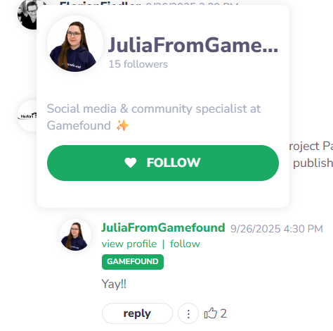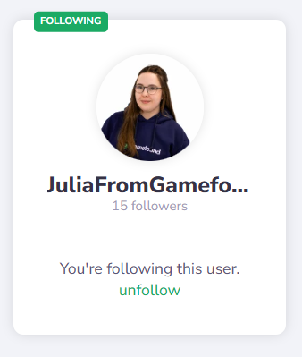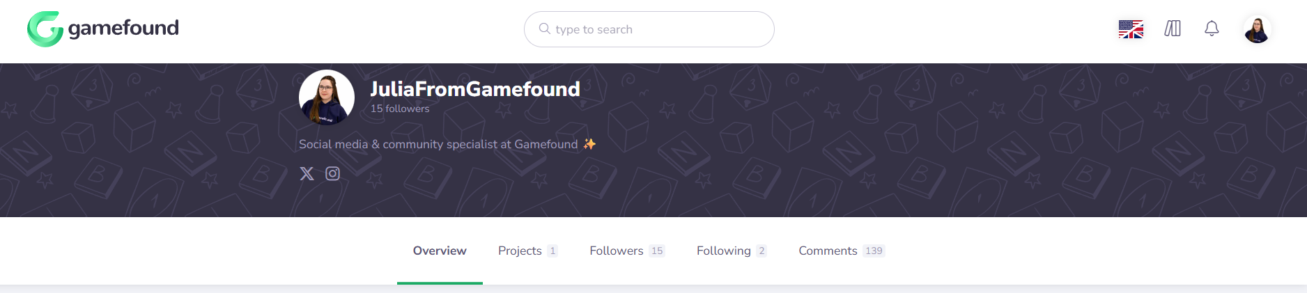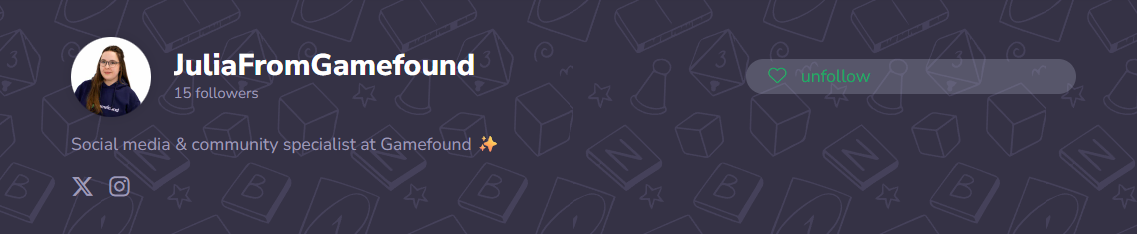You can follow other users on Gamefound and keep up to date with their gaming interests and most important activities. You can see all people who follow you and are followed by you in your profile, as well as all your backed and followed projects and comments. You can view profiles of others to see the same information - their backed and followed projects, comments they left in various discussions, and their community.