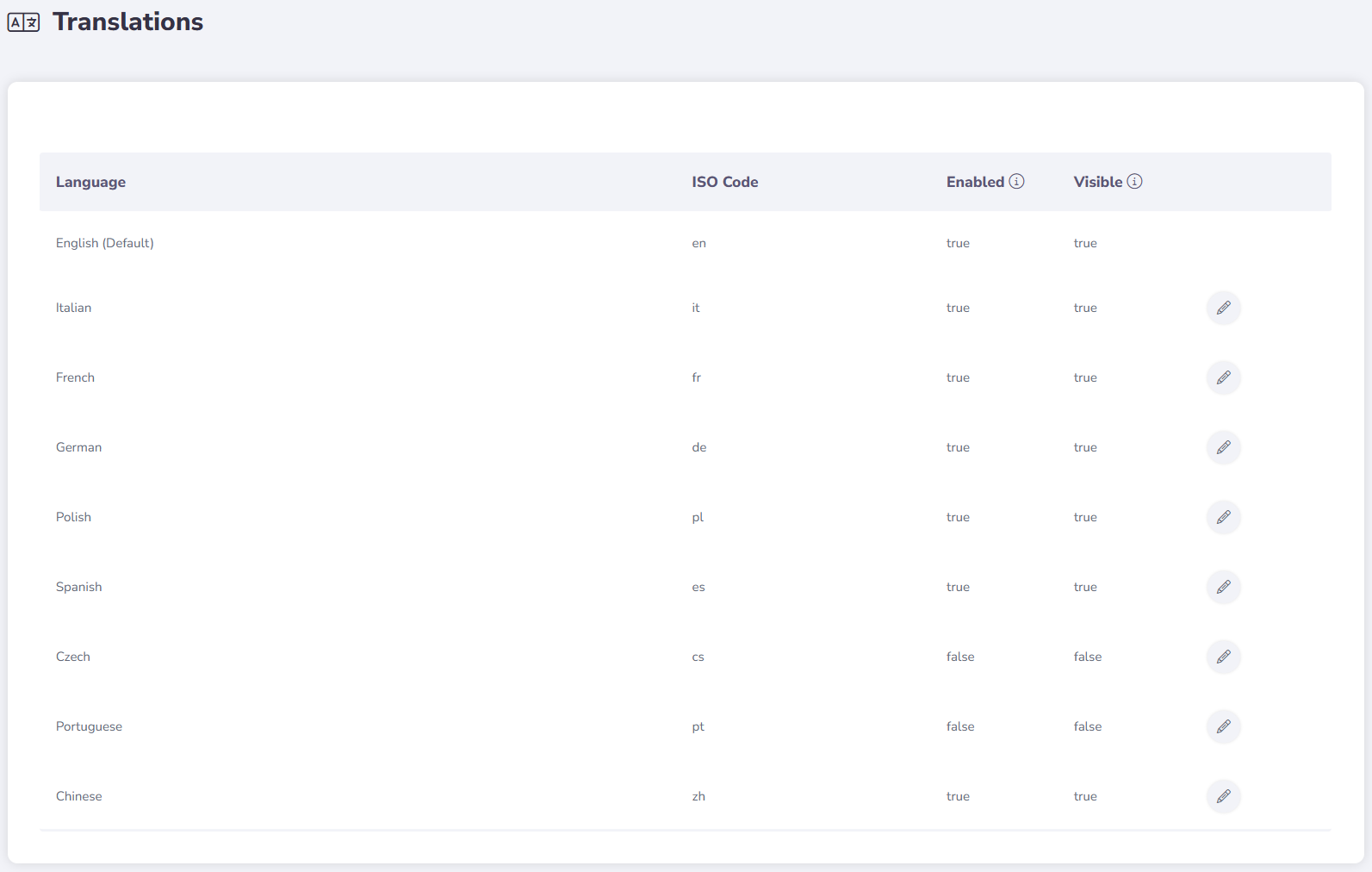 Click the pencil icon to enable the language and change language visibility - if you want to input content in certain language version, enable it first. Once you're done, publish it by changing the visibility to true.