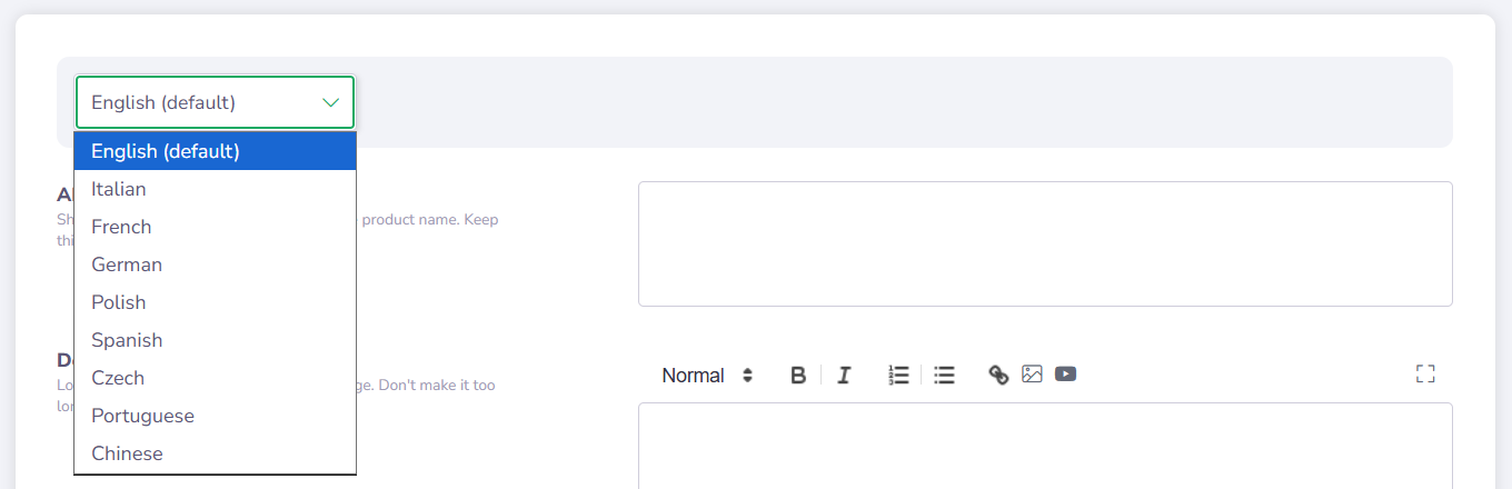 Change the language to edit the reward/add-on/project description. The system will automatically display the sections you can edit in the selected language. You can make changes to other product/add-on settings (price or published status, etc.) only in the default language.