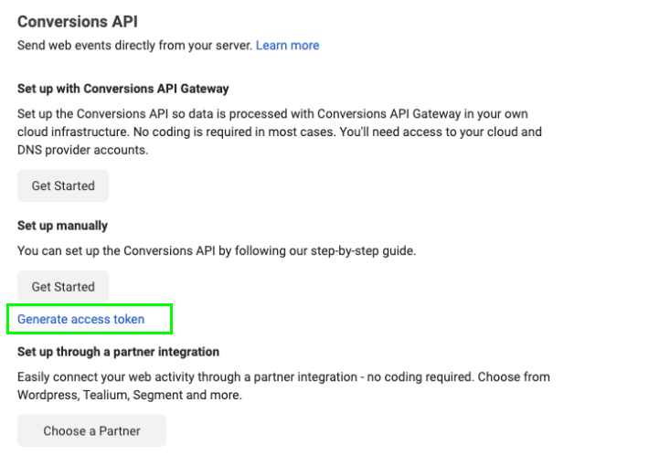 You can find your Facebook CAPI token in Events Manager by going to the Settings tab of your pixel, scrolling to the Conversions API section, and clicking Generate access token.