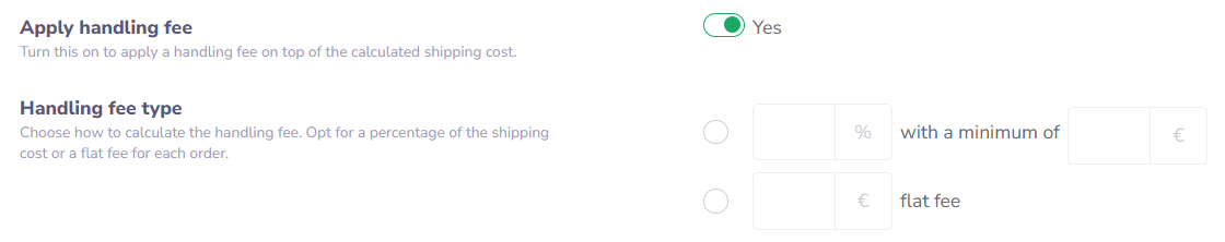 Turn on handling fees to add a charge on top of the calculated shipping cost (minimum shipping cost is not considered).