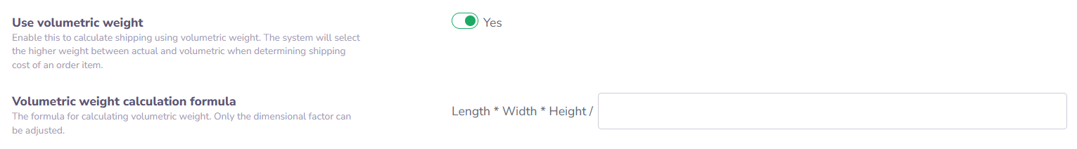 Turn on volumetric weight to calculate shipping based on both actual weight and volumetric weight.